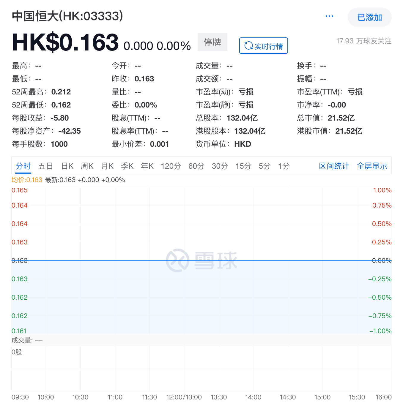截至停牌前,中国恒大已经沦为“仙股”,报0.163港元/股,总市值仅为21.52亿港元。