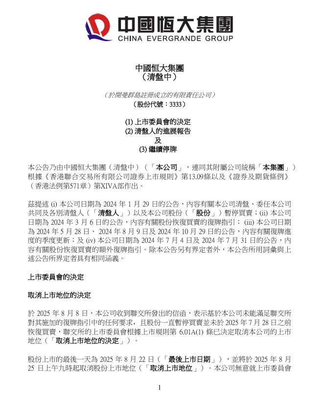 8月12日晚间,中国恒大(股票代码:03333.HK)(清盘中)突然发布公告称,公司将在8月25日从港交所退市。