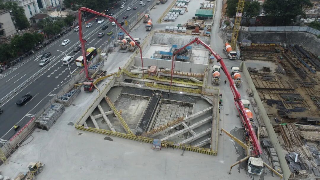 作为超深车站,京溪路站的混凝土用量巨大,车站单次最大混凝土浇筑量达2525立方米。为确保施工质量和效率,项目团队组建技术攻坚专班,采用“分段分层浇筑+喷淋温控养护”工艺。针对主体结构施工中应用的高支模体系,建设者们还布设应力传感器和位移监测设备,通过智能平台实现数据实时分析与预警,及时做好风险监控和处置,确保高支模体系在混凝土浇筑及养护期间的稳定性,为结构施工安全增加了“防护锁”。