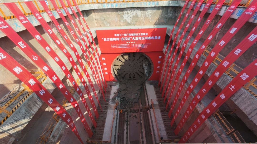 方石站至白方盾构井区间隧道全长约1850米,隧道最浅覆土仅约8.74米,超80%区段穿越强粘性泥质粉砂岩地层,刀盘易结泥饼。隧道还需下穿铁路桥桩、高速公路,并以最小6.8米的距离与在建芳白城际铁路隧道“贴身”并行,施工扰动控制难度极大。为应对复杂工况,广州地铁联合中铁建华南建设广花城际总承包部、中铁十一局的建设者们经过多次研讨,决定采用单洞双线的施工方案,选用了以广州命名的“羊城号”大直径盾构机实施作业。